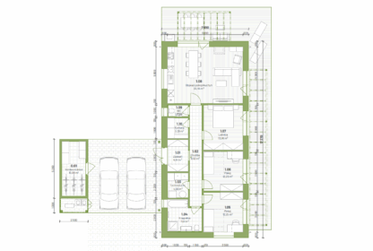 Model VYKY 100 nabízí prostorný obývací pokoj s kuchyňským koutem, hlavní ložnici, dvě další obytné místnosti, koupelnu, samostatné WC, technické zázemí a skladovací místnost. Dispozice je promyšlená tak, aby odpovídala běžným potřebám moderní rodiny.