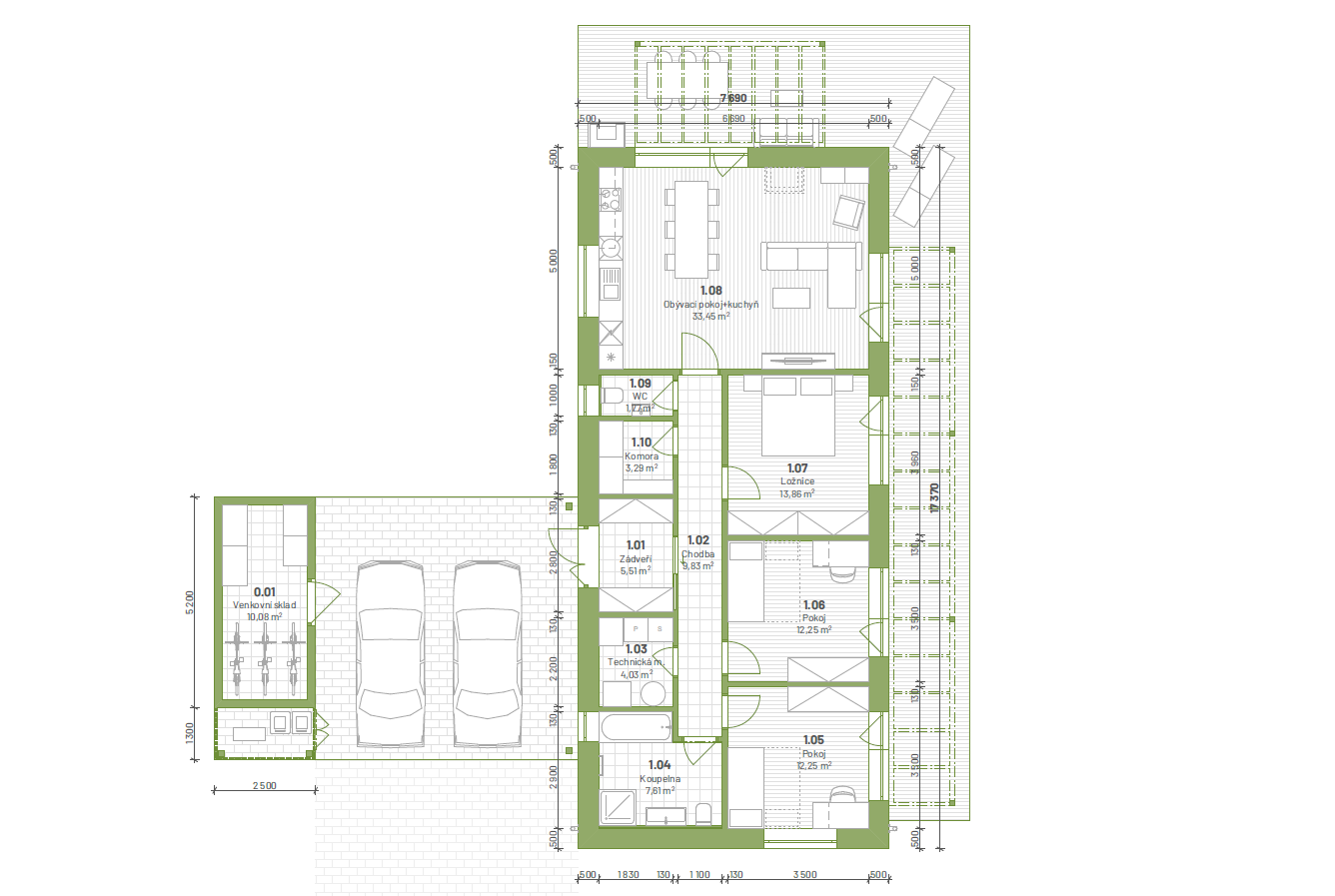 - Velkorysý obytný prostor propojený s venkovní terasou